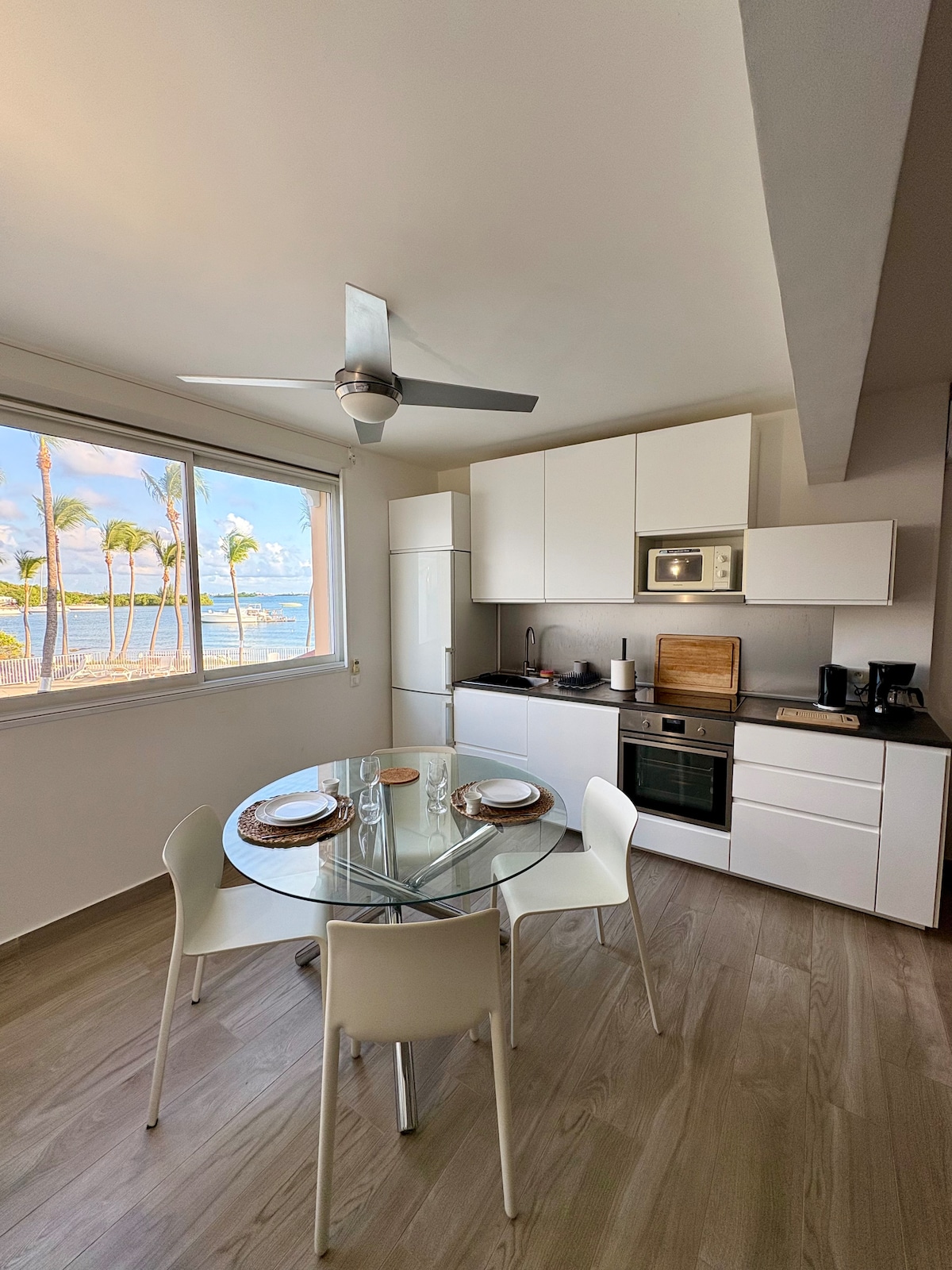 Directly on the beach with sea view and swimming pool, villa decorated residence, located in a quiet residence 4 swimming pools, 2 tennis courts, private parking. Opposite: Mini-market, restaurant, delicatessen, bakery, hairdresser, pharmacy, doctor, car rental, and jet skis. You will admire the beauty of the immense palm garden and in the evening before sleeping, the lights of the Island of Anguilla will soothe you, you will feel at home