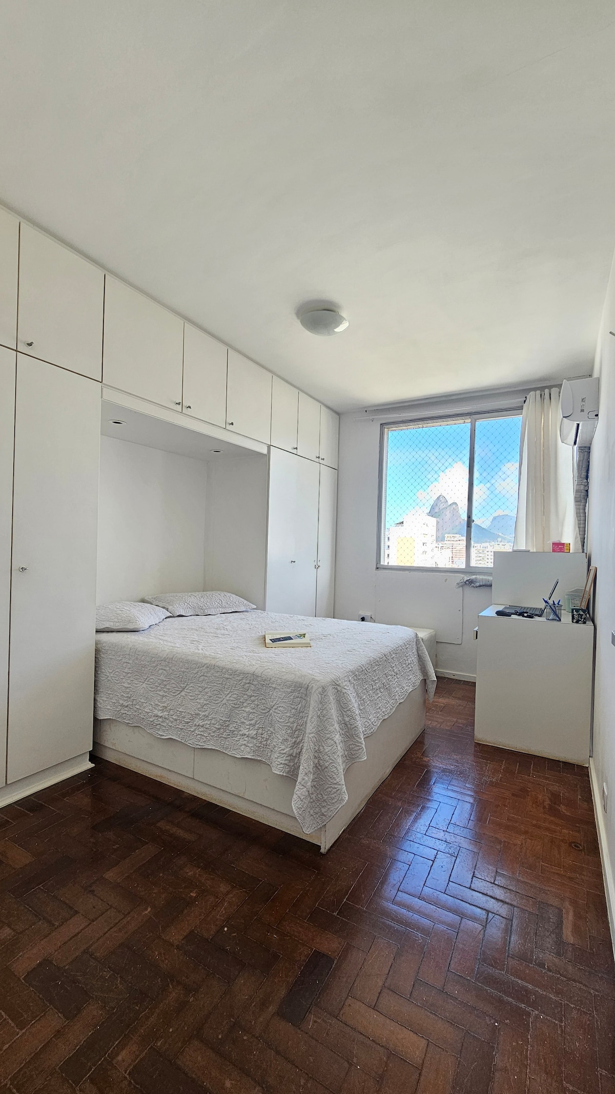Enjoy a stunning and unique view of both the ocean and the mountain in a centrally located 2 bedroom renovated apartment in Leme, Copacabana ideal for families and couples. The apartment is cozy and has everything you need to make you feel at home. A very spacious and stylishly decorated living room, and a fully equipped apartment. One bedroom has a queen bed, the second bedroom has 2 single beds, and there are 2 more mattress/futons that can be placed in the living room if needed.