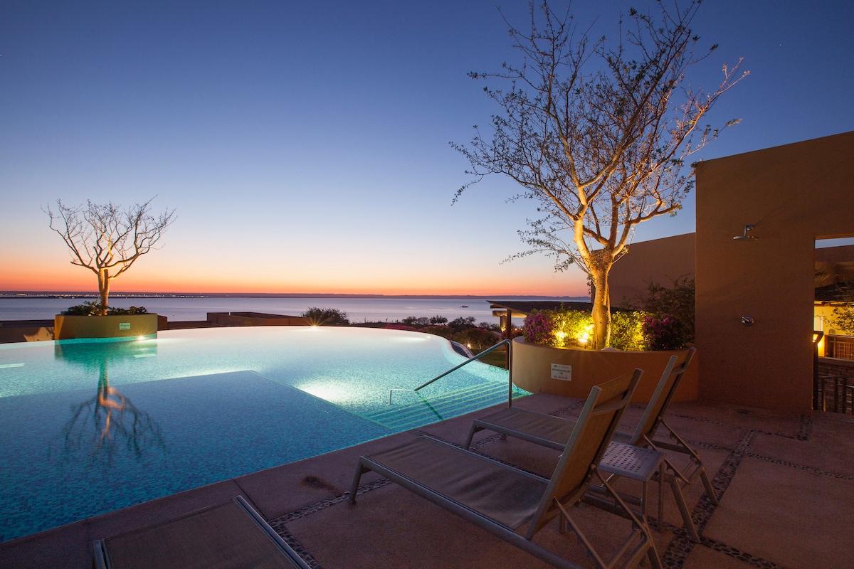 - Sweeping bay and Arch views from your private wraparound terrace: perfect for morning coffee or sunset cocktails. - Tennis courts, climate-controlled pool, and fully-equipped gym. - Two spacious bedrooms sleep 6 comfortably with a dedicated workspace, full kitchen, and in-unit washer/dryer. - Walk 5 min to Costco and Soriana for easy grocery runs or visit the marina restaurants and nightlife. - Reserve now for a serene retreat with all comforts and a welcoming host!