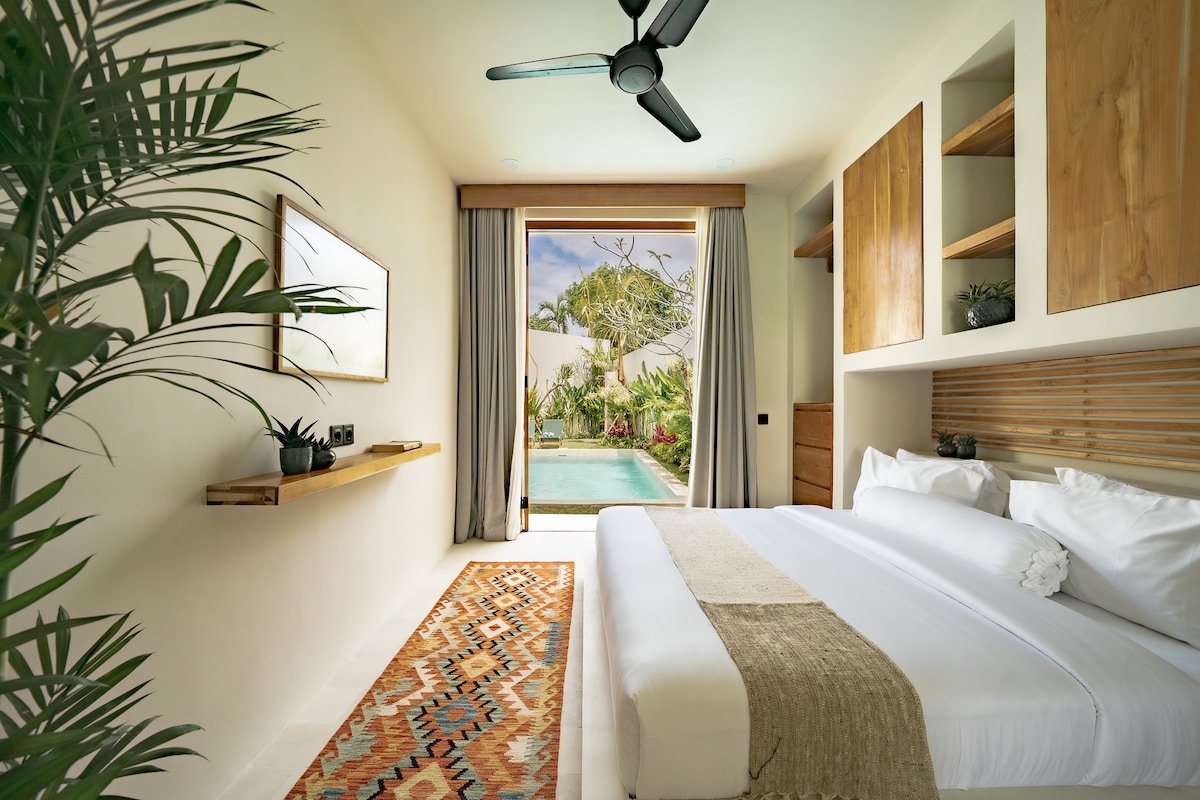 Villa 1BR úrnua nua - aimseartha roinnte ar 2 leibhéal fairsinge go hiomlán príobháideach agus foirfe do lánúineacha nó do thaistealaithe aonair. Níl ach siúlóid ghearr chuig Dreamland Beach nó El Kabron le haghaidh vibes dodhearmadta luí na gréine. Tá go leor spáis ann chun do scíth a ligean, scíth a ligean ar na leapacha gréine, taitneamh a bhaint as oíche theolaí le teilifíseáin mhóra, nó rud éigin blasta a chócaráil sa chistin atá feistithe go hiomlán. Agus tránna Bingin agus Uluwatu díreach nóiméad ar shiúl, is é seo do bhunáit fhoirfe do laethanta trá, seisiúin surfála, agus tráthnónta aislingeacha cois aille.