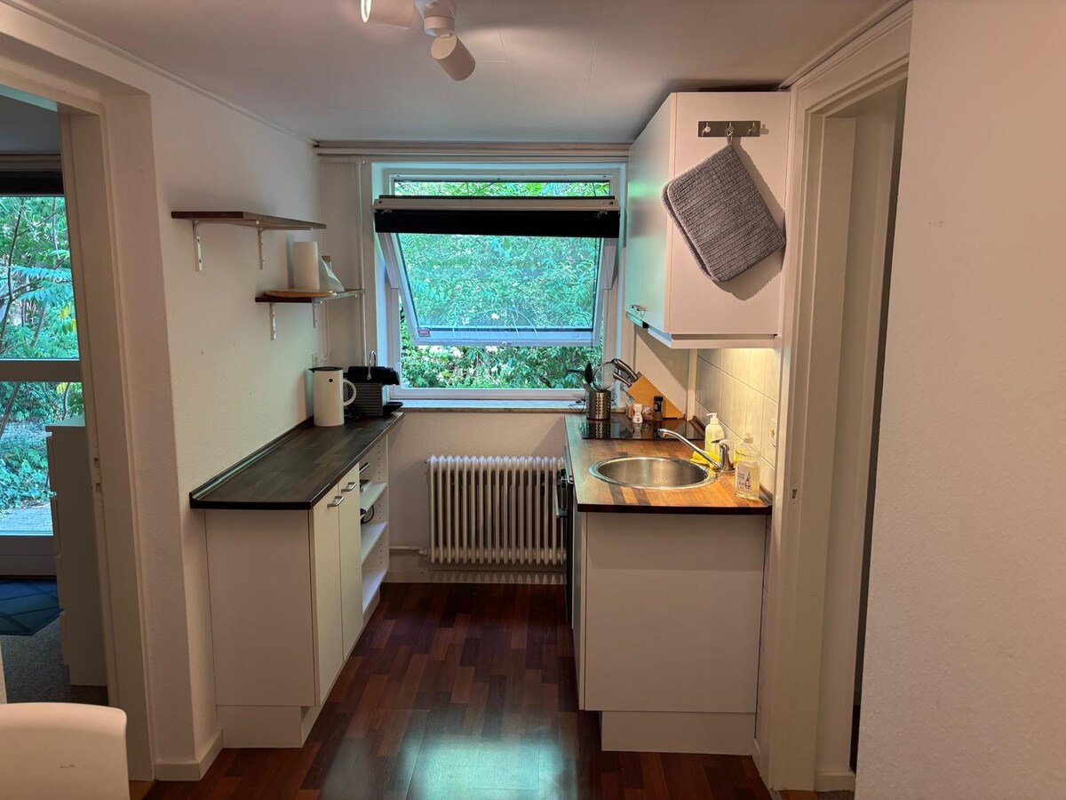 Tá an spás seo mar chuid d'íoslach villa mór, áit nach bhfuil ach teaghlach ina gcónaí ar an urlár uachtarach, a bheidh mar óstach agat. Tá seomra leapa mór dúbailte sa spás seo, cistin bheag ach iomlán chomh maith le leithreas atá scartha ón gcithfholcadán. Tá an rochtain ar an spás seo trí ghairdín príobháideach ciúin amháin, ar fáil do na haíonna amháin, agus le beárbaiciú/suíocháin lasmuigh. Níl an tsráid gnóthach agus tá páirceáil saor in aisce ann. Is féidir teacht ar an stáisiún S - traenach a fhreastalaíonn ar lár na cathrach trí shiúlóid 10 nóiméad.