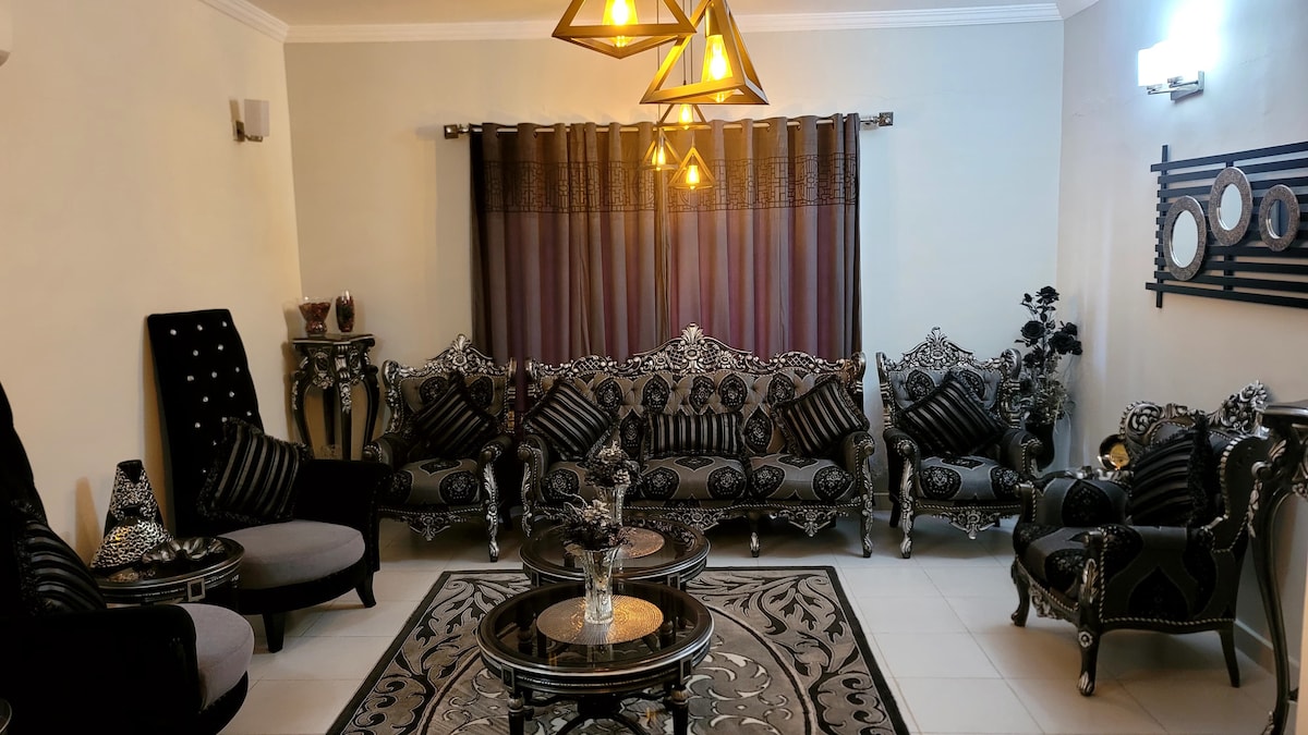 Is aonad iomlán geal neamhspleách é ina bhfuil maisiúchán nua - aimseartha, 3 sheomra leapa ina bhfuil seomraí folctha ceangailte, tolglann fairsing, cistin lánfheistithe agus barr dín. Tá A/C i ngach ceann de na 3 Sheomra Leapa le troscán compordach chun an mothúchán a shocrú le haghaidh fanacht breá suaimhneach. Mar gheall ar shuíomh an fhoirgnimh tá sé oiriúnach do theaghlaigh nó do ghrúpaí móra, a fhreastalaíonn go héasca ar 6 -7 duine fásta agus ar pháistí Tiomáint 15 nóiméad go dtí an t - AERFORT, Lucky One Mall & Dolmen Mall Tariq Road. Chomh maith leis sin tiomáint 7 nóiméad chuig (Maskan) sráid bhia.