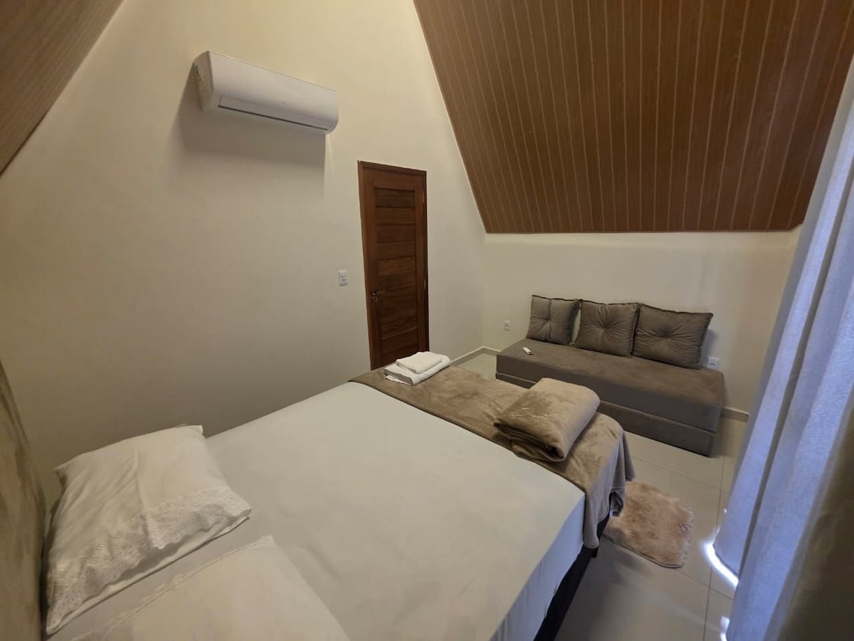 Alta Vista Chalet in Bananeiras, Paraíba, le 3 sheomra leapa agus 3 sheomra folctha, atá oiriúnach do theaghlaigh nó do ghrúpaí. Feistithe go hiomlán le Wi - Fi, teilifís, agus cistin iomlán, tá seomra suí teolaí agus balcóin sa réadmhaoin ina bhfuil radhairc iontacha ar an dúlra. Bain sult as compord, príobháideacht agus suaimhneas i dtearmann i sléibhte Paraíba, timpeallaithe ag radharcra dochreidte agus aeráid éadrom.