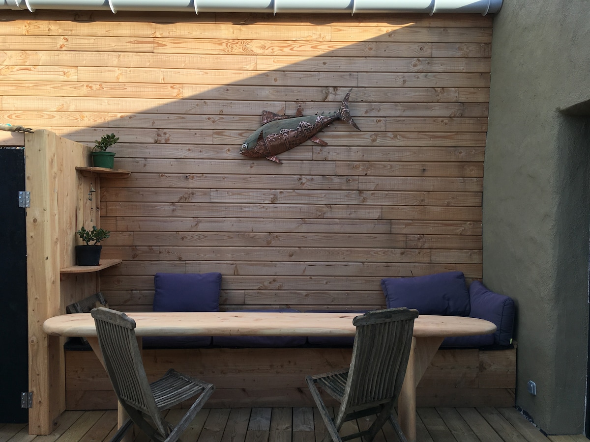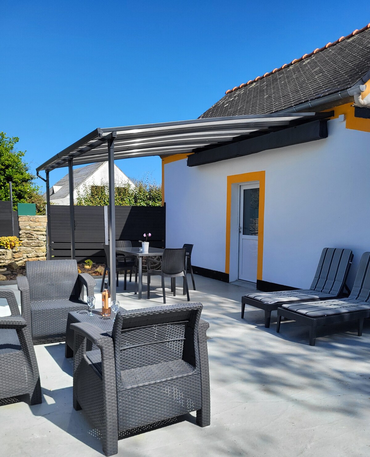 Tá ár dteach beag i gcroílár sráidbhaile atá ina chónaí in Belle Ile, a bhuíochas dá ionad eachaíochta. Suite 200 méadar ó thrá álainn agus ó chuaráin fhiáine, is féidir dul ag fánaíocht ar chosáin an chósta ón teach. Compordach, idir thuathúil agus nua - aimseartha, tá sé te, beidh tú ar do shuaimhneas ann. Is cuid lárnach den teach é an t - ardán, atá os comhair an deiscirt. Tá an troscán déanta ag Axel, le hadhmad Belle Ile.