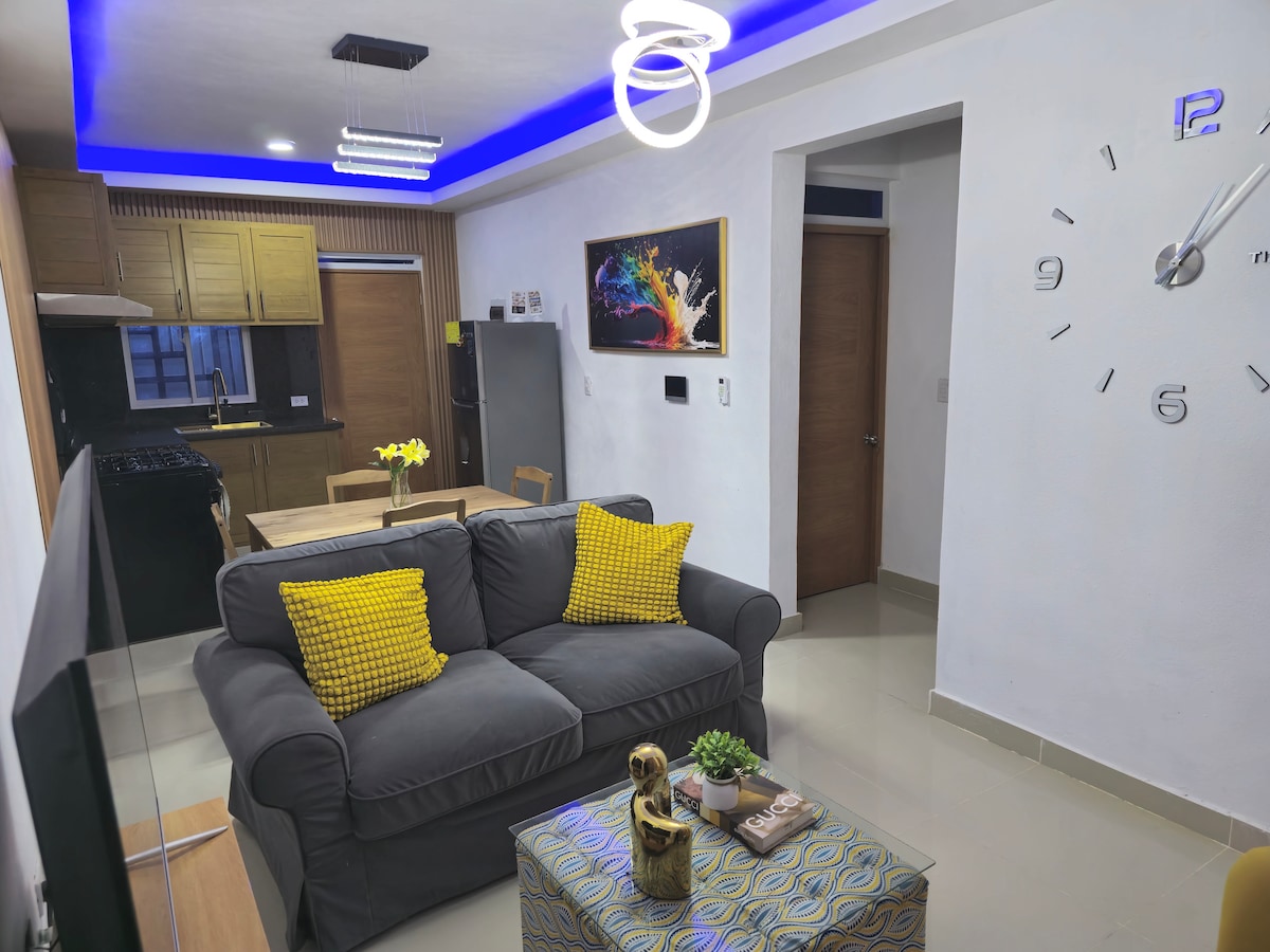 Bain sult as eispéireas agus fanacht maith san árasán seo i stíl an leiththí atá feistithe go hiomlán. Níl sé suite go lárnach ach 5 nóiméad ó thrá Almonds agus 5 nóiméad ó lár sráidbhaile Peravia (Baní). Áit shábháilte chiúin le 2 pháirceáil san áireamh. Tá feithiclí ar cíos againn freisin agus is féidir linn tú a phiocadh suas ag an aerfort 🛬 (Ní ghlacaimid le 6 aoi ar feadh 1 oíche) (Gan ardaitheoir)