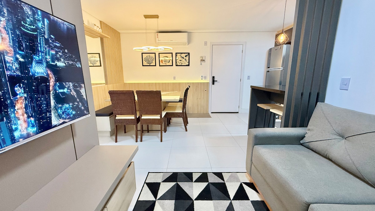 Relaxe neste espaço de bom gosto, conforto e tranquilidade. * Sala c/vista Mar e por do sol * Cozinha equipada p/a preparação de um jantar de chef, como p/um lanche rápido. Louças, taças, panelas, airfreyer * Banheiros c/ducha a gás * Suíte: Acorde olhando o mar, cama Queen, colchão king koll, muito confortável * Quarto/Escrit. Bancada p/trabalho c/ vista mar e Cama casal box * Smart TV c/assinatura de canais * Internet * Ar Condicionado em todos os cômodos Um luxo