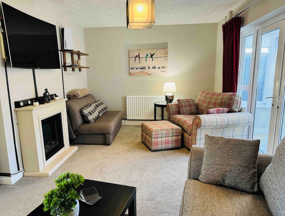 Perfect for Business Travelers, Contractors, families & couples — relax with a Jacuzzi, gym, PS5, pool table, fast WiFi and a private driveway for multiple vehicles. just a short drive from Hereford hospital and Cathedral, the city centre and nearby pubs. *• 3 inviting bedrooms* *• King bed* *• Fully equipped kitchen with air-fryer* *• Netflex* *• Log-cabin gym with pool table* *• Downstairs cloakroom* *• 2 private parking spaces* *• PS5* Send us a message for your perfect stay