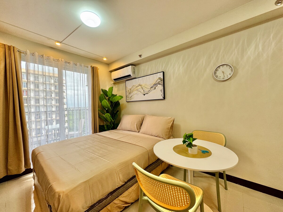 Resort like ambience Korean inspired design Brand New studio type condo with superb amenities. • 12th flr. w/ balcony view of CCLEX, City Skylines, mountain and sea • Double bed w/ pullout hotel like mattress and pillow with protectors lamp shade • Dining Area/Washing Machine • 214 MBPS wifi, TV 50 inches 4K HD signed in Netflix • Kitchen Area with basic cooking wares & appliances • Free use of 2 Olympic size Swimming Pool and a Kiddie pool • Smart Lock Check-in • Elevator