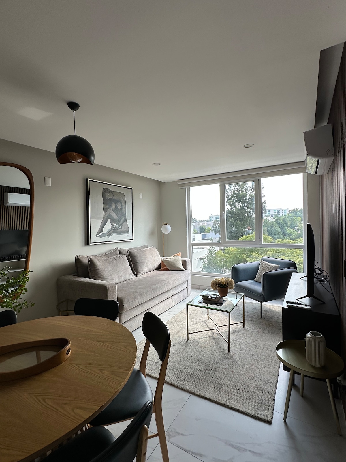 Acogedor departamento nuevo a solo 5 min. de salones de eventos como Hacienda La Escoba, La Magdalena, Casa Clementina, La Benazuza, La Tara. Relájate en este espacio tranquilo con una vista hermosa. Habitación ppal: 1 cama matrimonial Estudio: 1 sofá cama matrimonial El edificio cuenta con seguridad, cajón de estacionamiento y alberca, el departamento se encuentra en una zona muy tranquila donde alrededor podrá encontrar, cruz verde, farmacias,tiendas, gimnasios etc.