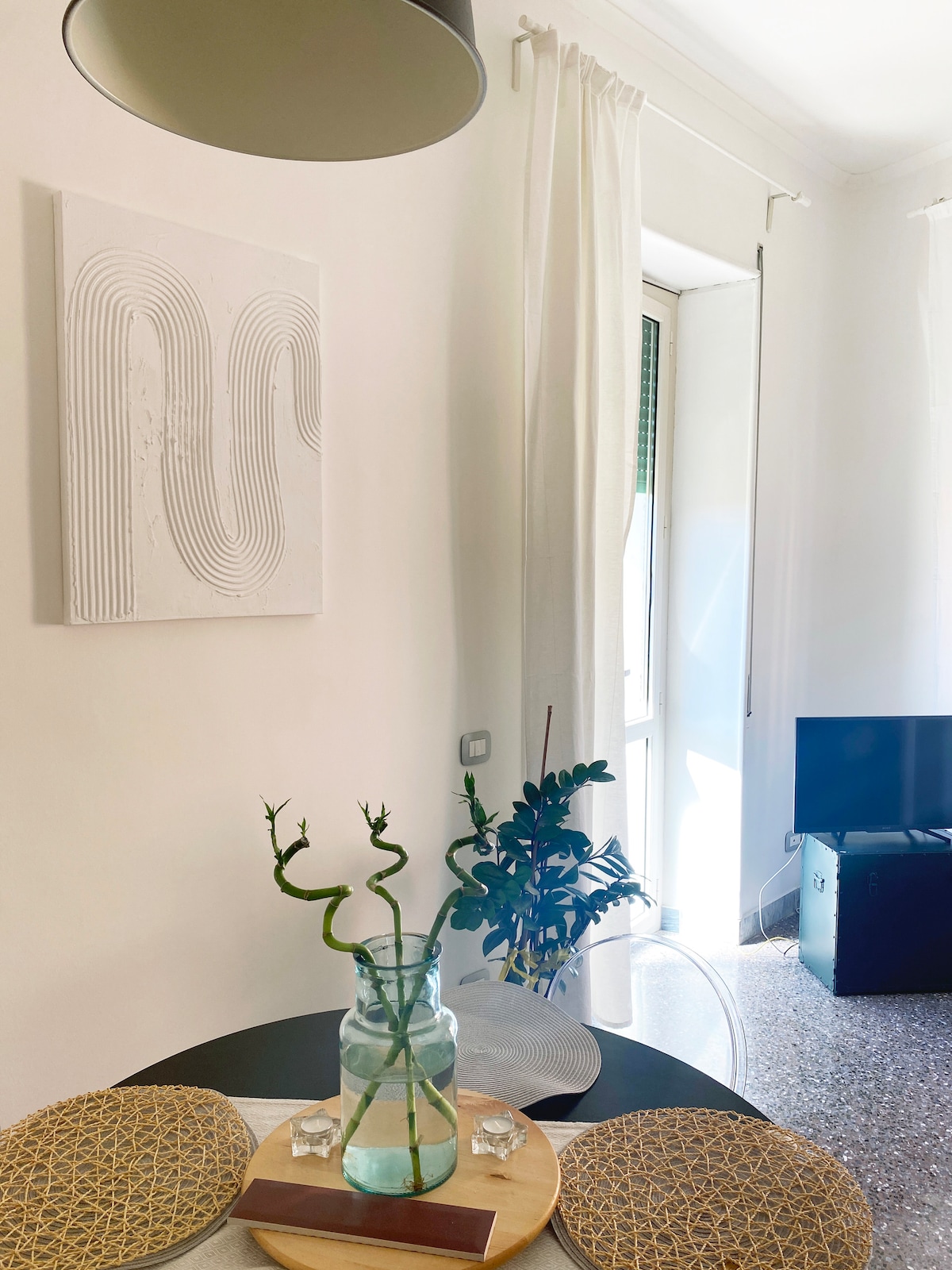 Teach saoire ar urlár na talún, 40 méadar cearnach suite ar bhóthar atá lán de bhialanna agus de mhargaí. Féidearthacht Féinseiceáil isteach. 300 méadar ón Metro (Subway) agus 100 ón tram. Lena naisc, tá sé éasca teacht ar na príomhláithreáin turasóireachta amhail an Colosseum, an Vatacáin agus Fountain Trevi. Feistithe le gach compord, athchóirithe agus machnaimh síos go dtí na mionsonraí is lú. Cistin iomlán, miasniteoir, micreathonnán, oigheann, folcadán, cithfholcadán, aerchóiriú, 2 theilifíseán! Níl rud ar bith ar iarraidh!