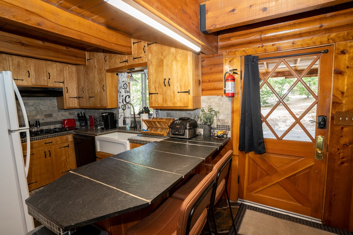 Fáilte chuig ár dtearmann cábáin logála só atá dírithe ar theaghlaigh, in aice le talamh Foraoise Náisiúnta na Stát Aontaithe. Lena fhíor - dhraíocht cábáin logála, le deiceanna timpeall ag breathnú amach ar chreagán ó cheann ceann na bliana. Tugann an teach trí - leibhéal 2700 troigh cearnach seo an meascán foirfe de ghalántacht thuathúil agus compord nua - aimseartha. Foirfe do theaghlaigh tá trí sheomra ar leith inár gcábán, a bhfuil a sheomra folctha príobháideach féin ag gach ceann acu, chomh maith le lochta agus tolg codlata banríona sa seomra suí. Teach atá dírithe ar theaghlaigh, NÍ teach cóisire. Lic 2022 -0844