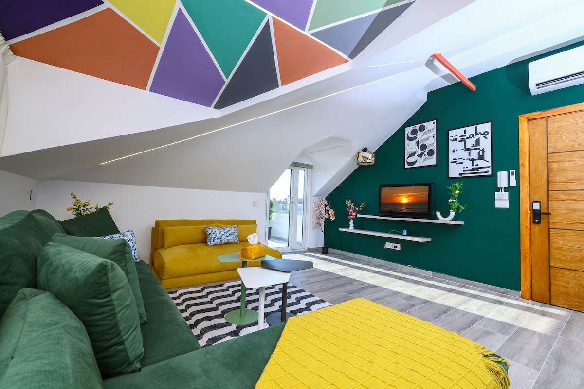Tá pearsantacht uathúil ag baint le teach aíochta ar dhíon Biome. tá ardán leathan ann inar féidir leat do scíth a ligean agus scíth a ligean. Chomh maith le ceantar bbq whe is féidir leat teacht le chéile le cairde agus le do theaghlach. Wi - Fi agus stáisiún oibre chun oibriú gan bhriseadh le hidirlíon ardluais. tá radharc álainn ar an bhfarraige agus radharc sléibhe san áit. seomra folctha príobháideach don phríomhsheomra leapa. seirbhísí sruthaithe le haghaidh siamsaíochta. atmaisféar ildaite. timpeallaithe ag greenery. Cuirimid leaba thoilg mhór chompordach ar fáil freisin chun freastal ar níos mó aíonna.