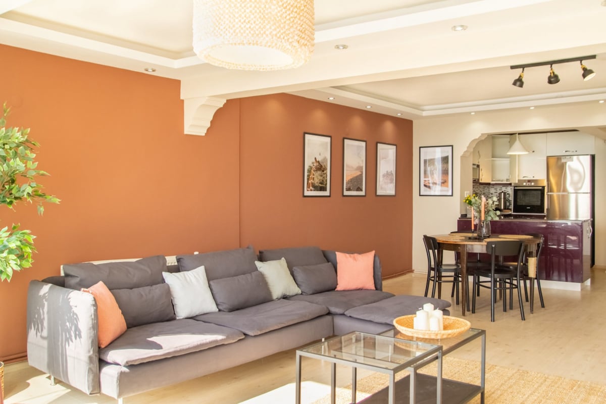 Enjoy city life in our modern apartment, just a 3-minute walk from the Karşıyaka waterfront. ☀️ Sip your morning coffee on the spacious terrace and watch the sunset in the evening. 🚃 The tram, train, and ferry are all within walking distance, and there’s a direct train from the airport. 🏡 With 2 bedrooms, a fully equipped kitchen, fast Wi-Fi, and a cozy living area, you’ll feel right at home. ❗ Please note: The building has no elevator, but a few steps lead to a modern flat with a charming te