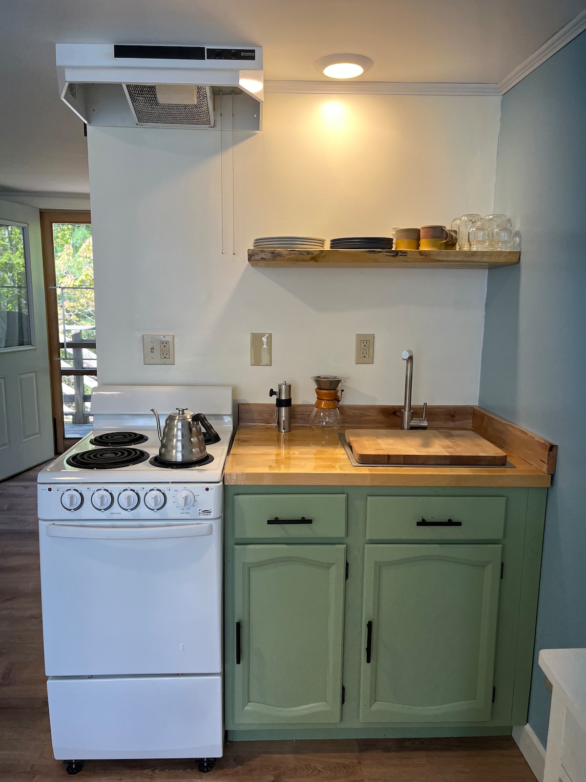 Cábán Aframe nua-aimseartha, tuathúil ar 10 n-acra coillte; maisiúchán álainn simplí, cistin lánfheistithe, gach fearas, sorn gloine, oigheann aerfhríora, H2O scagtha/déantóir oighir. Bain sult as seomra folctha sómasach, le hurlár tíleanna téite, cithfholcadán siúil isteach. Cuirtear tuáillí, seampú/feabhsaitheoir/cabhail ar fáil. Leaba rí in lochta agus leaba rí NUA ar an bpríomhurlár. Teilifís Chliste, Wi - Fi. Leabhair, cluichí Téann an tSorn Adhmaid an cábán go foirfe sna míonna níos fuaire. Gach adhmad curtha ar fáil. Tá aonad teasa/ac minisplit ann freisin.