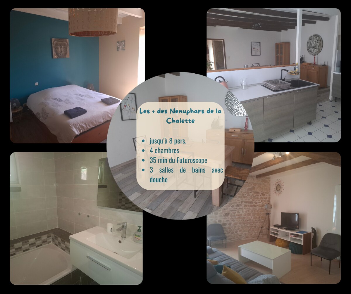 Troscán do 8 nduine, atá suite 30 nóiméad ó Futuroscope , Aquascope agus seomra Arena. 20 nóiméad ó La Roche - Posay ( Spa) Príomhurlár: Tolg, teilifís, Wi - Fi, cistin , déantóir caife scagaire, Tassimo, seit raclette, Seomra leapa 1 leaba 140, leithreas , seomra cithfholcadáin. Thuas staighre: Seomra leapa 1 leaba 140 le teilifíseán, seomra leapa 1 leaba de 140 agus 2 leaba de 90, seomra folctha le leithreas. Meaisín níocháin, triomadóir, troscán gairdín, beárbaiciú, Ar iarratas Línéadach leapa agus folctha € 11/duine in aghaidh an fhanachta