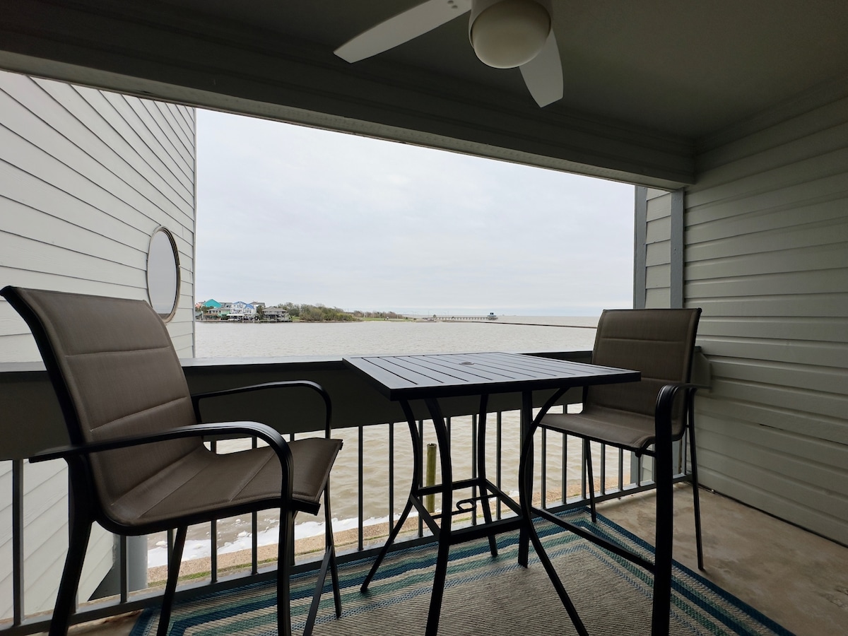 Neadaithe laistigh de Mhuiríne Pleasure Island, ag tairiscint bádóireachta agus iascaireachta ar an Sabine Lake gleoite. Tá an t - aonad árasán geataithe seo ar an dara leibhéal le rochtain ardaitheora, codlaíonn sé suas le ceathrar go compordach, agus cuimsíonn sé leaba bhanríona sa seomra leapa, seomra folctha le cithfholcadán, beár, cistin, ithe i gclochán do bheirt, oileán cuntar cistine le trí stól beáir, seomra suí le tolg codlata banríona, teilifíseán cliste mór 52 orlach, Wi - Fi saor in aisce, cábla, balcóin le dhá chathaoir barstool Adirondack, agus radhairc dhochreidte!