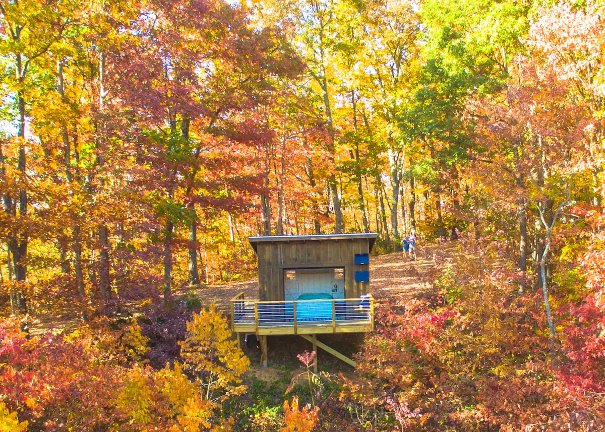 *4x4 or AWD only* Escape to our tiny modern off grid cabin situated in the middle of our private 125 acre mountain top forestry management land which backs up to Pisgah National Forest. Wake up to soaring mountain views, hike all day on the Blue Ridge Parkway, grill out and make S'mores over the fire pit, and then roll open the glass garage door to fall asleep under the stars in a comfy bed...just 25 minutes to downtown Asheville! Heated by a wood stove. All pets are welcome!