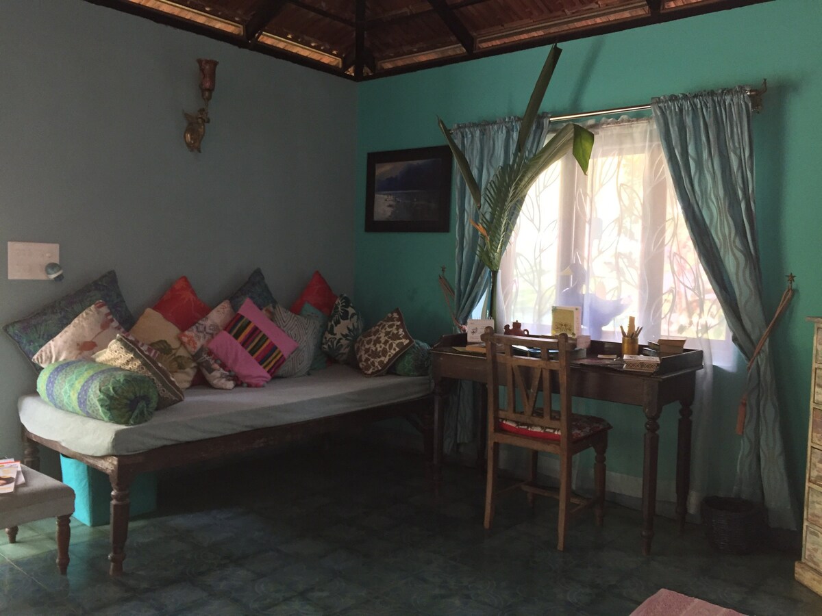 Faigh suaimhneas domhain ag Happy Moon Homestay, tearmann atá cairdiúil don chomhshaol i sráidbhaile méith Goa. Ar shiúl ó thránna plódaithe, tá an villa geataithe suaimhneach seo timpeallaithe ag crainn ghairdín agus bíonn sé fionnuar go nádúrtha, agus tránna 25 nóiméad ar shiúl. Tá CCTV agus iontráil RFID ag an áitreabh le haghaidh slándála breise. Bain sult as cúltaca cumhachta 24 uair an chloig, seomraí aerchóirithe, uisce te, Wi-Fi 200MBPS, uisce RO, meaisín níocháin, cuisneoir, agus cistin lánfheistithe. Faigheann aíonna cúrsaí taistil coimeádta freisin, agus ár mbéilí baile a bhfuil ardmholadh faighte acu.