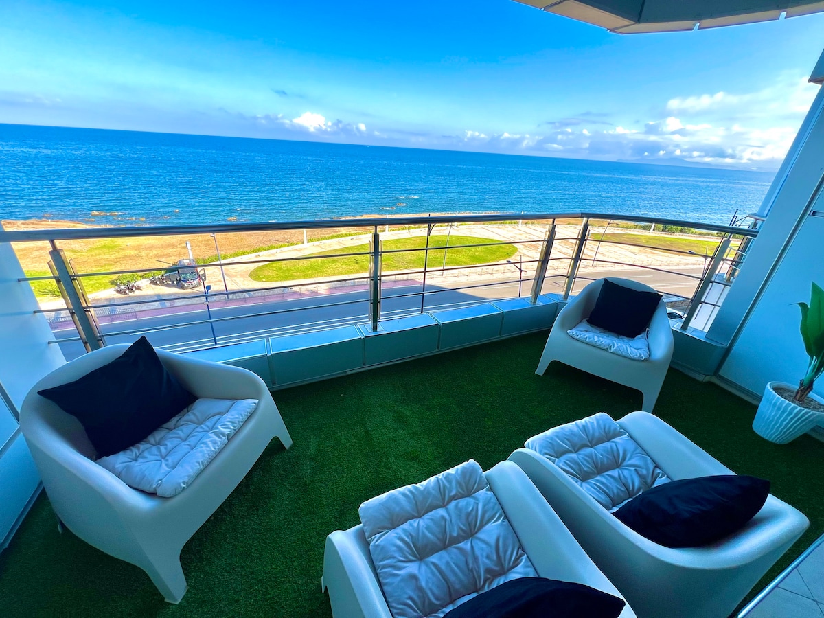 Liostú le radhairc ar an bhfarraige, gan dearmad a dhéanamh air lena n - áirítear: - 3 sheomra leapa: seomra amháin do pháistí ina bhfuil 2 leaba bhuinc, 2 sheomra leapa dhúbailte (1.6m*2m) - Ardán 20 méadar cearnach le tábla do 6 dhuine (áit itheacháin), radharc na farraige agus glaise, suite díreach in aice leis an gcistin. - Seomra suí le teilifís. - Ardán 100m², atá suite ar an díon le 12m d'aghaidh le radhairc den trá agus den fharraige agus achar scáthaithe de 15m². - Seomra folctha amháin le doirteal, cithfholcadán agus leithreas. - Leithreas ar leith