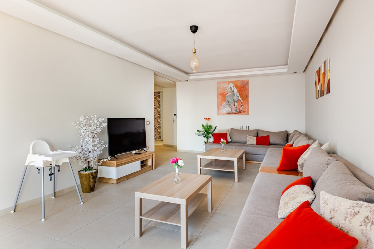 Tá an t - árasán 110 m2 trí tosaigh seo gar do gach láithreán agus saoráid (trá leis an Corniche de Mohammedia, linn snámha leath - mharfach agus linn snámha do leanaí, áit lasmuigh iata le tábla itheacháin cois linne). Tá sé feistithe le snáthoptaice, teilifís chliste (le cainéil Netflix agus cábla) agus dhá sheomra folctha (cithfholcadán agus folcadán). Tá radharc farraige aige ar an gcistin agus ar sheomra leapa na bpáistí. Is siúlóid 5 nóiméad é go dtí an pháirc agus lár na cathrach.