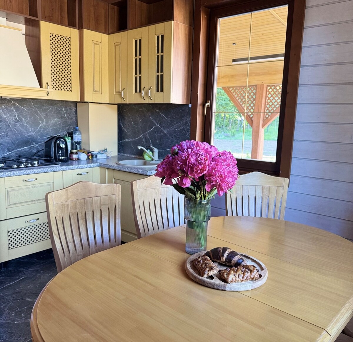 Tá dhá theachín ar cíos le hadhmad euro, suite in áit phictiúrtha in aice leis an abhainn. Codlaíonn suas le hochtar i ngach teachín agus tá ardáin fhairsinge ar leith ann óna bhfuil rochtain ar abhainn sléibhe. Tá ceithre sheomra leapa, dhá sheomra folctha, cistin lánfheistithe le cuisneoir, citeal, micreathonnán agus sorn cócaireachta i ngach teachín. I measc shaoráidí na réadmhaoine, is fiú an limistéar beárbaiciú a thabhairt faoi deara, atá feistithe le gríoscán leathan, tosaitheoirí dóiteáin, briogúin, gráta chun feoil a bhácáil.