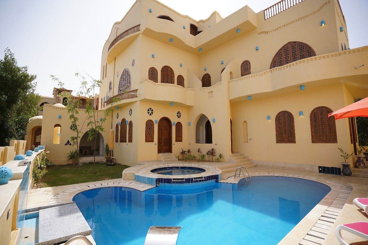 Beidh d'fhanacht gar d'ionaid an spáis uathúil seo. Villa First Row ag breathnú amach ar Loch Qarun 10 Seomra Folctha -10 seomra aerchóirithe go léir ina bhfuil 18 leaba - Tá na seomraí go léir ina máistir. Tá seomra folctha príobháideach i ngach seomra - Páirc mhór le haghaidh caitheamh aimsire agus taitneamh a bhaint as an dúlra Linn Snámha Phríobháideach Chlúdaithe - Tá an villa an - ghar do gach bialann cosúil le Kom Al Dikka Restaurant ibis 1 nóiméad idir Vela agus bialanna de shiúl na gcos D'áit fhoirfe le haghaidh saoire dhodhearmadta le do theaghlach agus le cairde agus chun cuimhní cinn ar feadh an tsaoil a chruthú