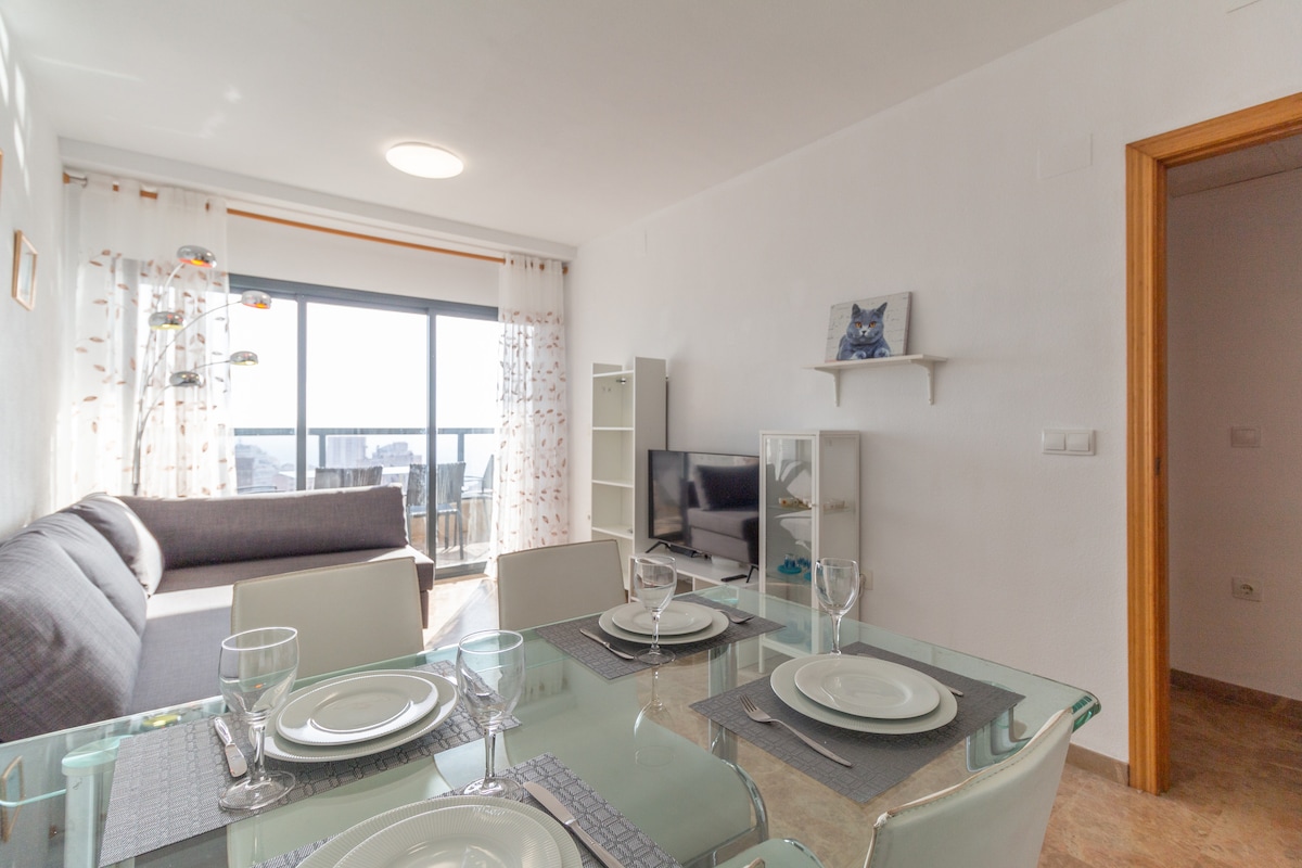Stiúideo den scoth le haerchóiriú agus radhairc áille ar an aigéan. Díreach 700 méadar ó thrá Levante (thart ar 9 nóiméad ag siúl). Ideal do lánúineacha. Vallado cónaithe le gairdín ollmhór, 2 linn snámha (oscailte i séasúr an tsamhraidh), 2 chúirt leadóige agus 1 chispheil + sacar. Tá Wi-Fi príobháideach saor in aisce, páirceáil, concierge agus faireachas 24 uair an chloig ann. 2 nóiméad ar shiúl go dtí ollmhargadh agus cógaslann. Ag 300m tosaíonn na cosáin fánaíochta agus tá Aqualandia agus Mundomar 2 km ar shiúl.