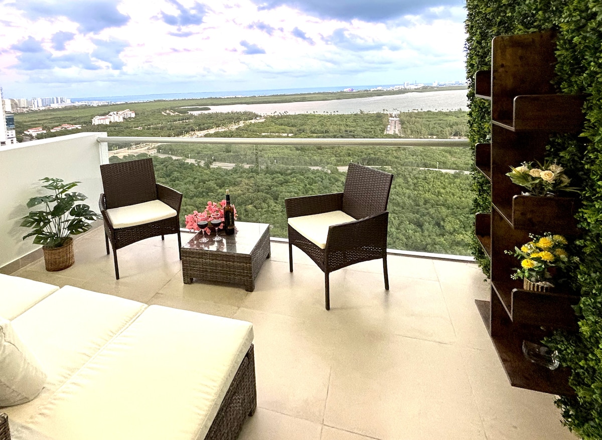 Departamento en piso alto con terraza privada y vista abierta al mar, la laguna y la Zona Hotelera. Desde aquí, la ciudad se observa desde arriba, con una sensación de amplitud, luz y calma difícil de encontrar en zonas céntricas. La terraza es el espacio ideal para desayunar, descansar o simplemente contemplar el paisaje. Ubicado en el corazón de Cancún, área de Malecón Tajamar, con acceso rápido a restaurantes, supermercados y vialidades principales, sin renunciar a una vista privilegiada.