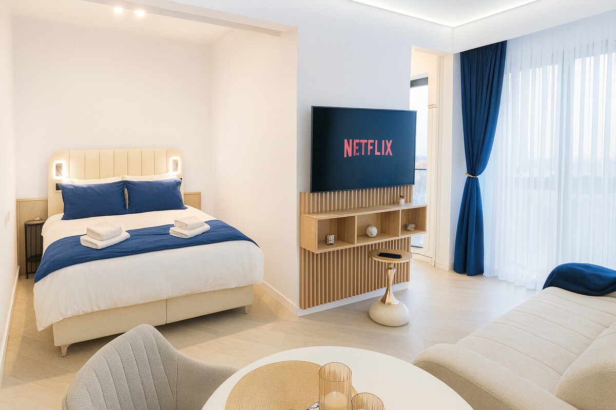 This modern and stylish studio apartment in Bucharest is perfect for a couple. It offers a cozy, spacious atmosphere with high-end furnishings and a smart layout. The kitchenette is well-equipped for light meals, and the bathroom is sleek and modern. Guests can also enjoy premium amenities, including a swimming pool and sauna, ideal for unwinding, for a fee of 100RON . This apartment provides the perfect blend of comfort, luxury, and convenience for a memorable stay in the heart of Bucharest.