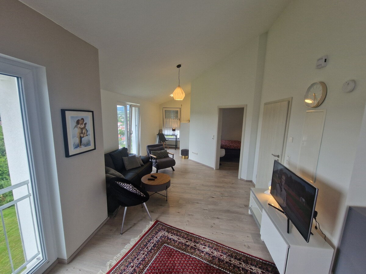 Árasán nua - aimseartha do suas le beirt. An chéad urlár le balcóin féin agus taobh thiar den ghairdín tí atá ar fáil. Cistin, áit itheacháin agus áit suí atá oscailte agus atá feistithe go hiomlán. Seomra leapa le leaba dhúbailte 140 cm m agus seomra folctha ensuite. Ceann amháin eile leaba thoilg dhúbailte a tharraingt amach i limistéar an tseomra suí. 180 cm. Seomra folctha nua - aimseartha le cithfholcadán agus tobán.