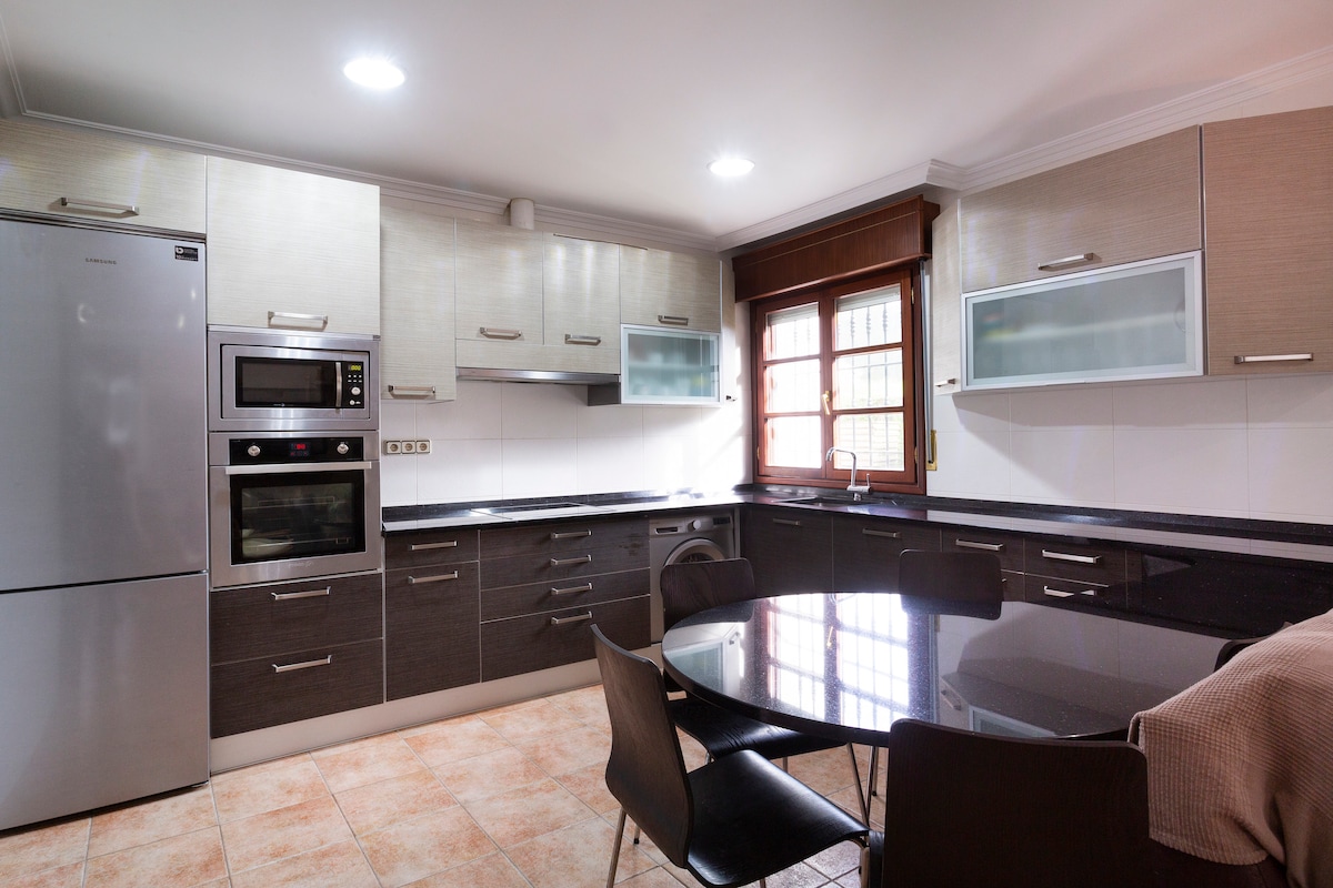 Teachín galánta ag bun Mount Oiz 💫 •Urlár na talún: seomra suí ina bhfuil teallach, seomra bia cistine agus seomra folctha ina bhfuil tobán folctha guairneáin. •An chéad urlár: 4 sheomra leapa (2 sheomra le seomra folctha príobháideach) + seomra folctha comhroinnte. • Póirse príobháideach. • Cumas: 8 nduine. Suíomh 📍iontach: in aice le bialann Trabakua Goikoa, 40 nóiméad ó Bilbao agus 30 nóiméad ón trá. 🌊✨ Éalaigh chuig an dúlra leis na compord go léir!