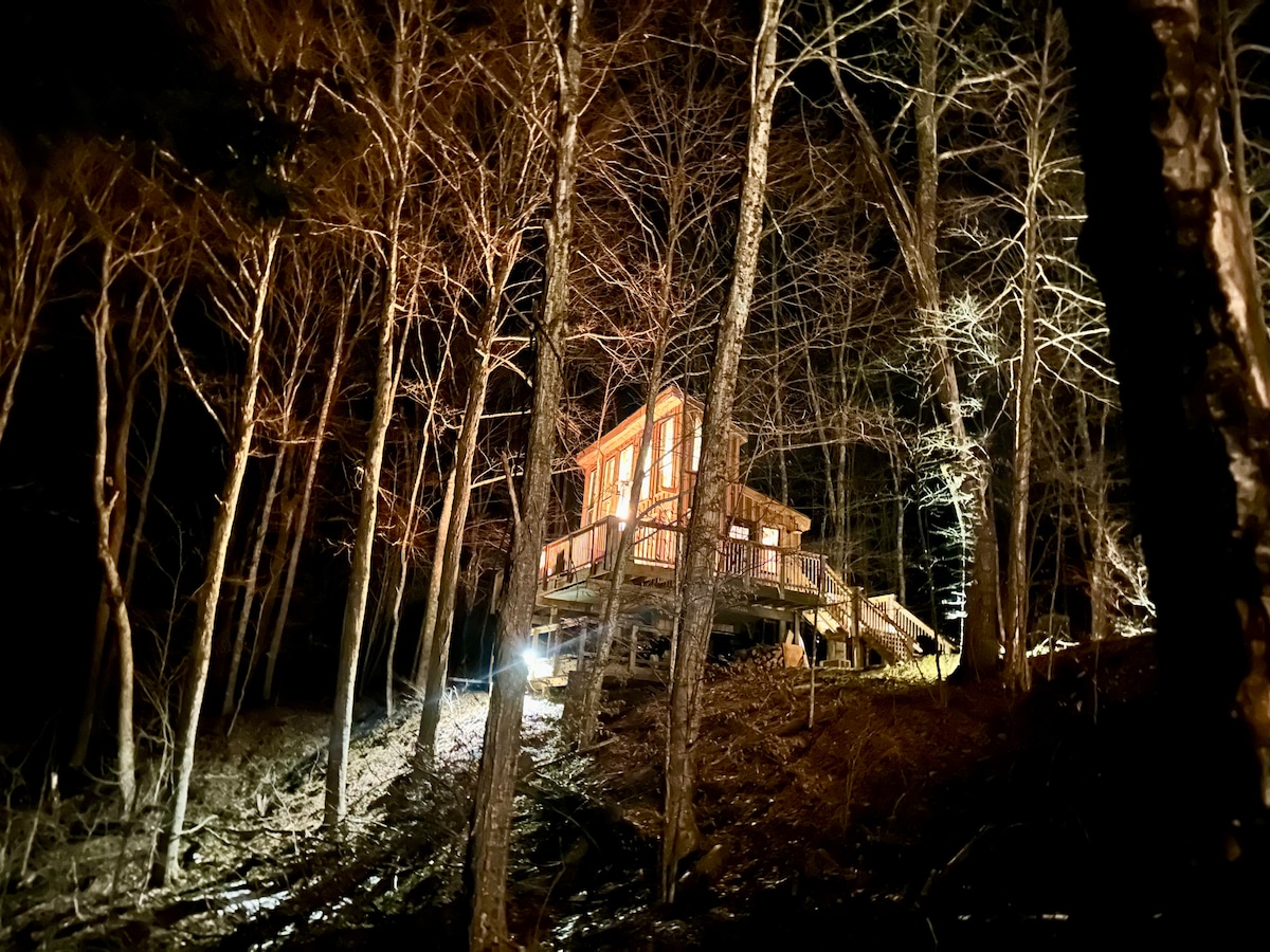 Fáilte go dtí ár dteach crainn draíochta! Chruthaíomar an áit chónaithe uathúil seo atá spreagtha ag an draíocht do dhuine ar bith a bhfuil dúil aige nó aici sa domhan draíochta a bhfuil an-dúil aige nó aici ann, nó do dhuine ar bith a bhfuil dúil aige nó aici le haonar i spás spraíúil. Agus tú ag trasnú na gcosán ardaithe, mothóidh tú go bhfuil tú ag dul isteach i dteach crainn draíodóirí san fhoraois. Tá an teach crainn 1,100 troigh cearnach suite i measc crann, agus is tearmann draíochtúil iargúlta é ón saol. An bhfuil ceist agat nó an bhfuil leisce ort? Déan teagmháil linn féach ar ár liostuithe eile le haghaidh tithe crainn i stíl ghlampála