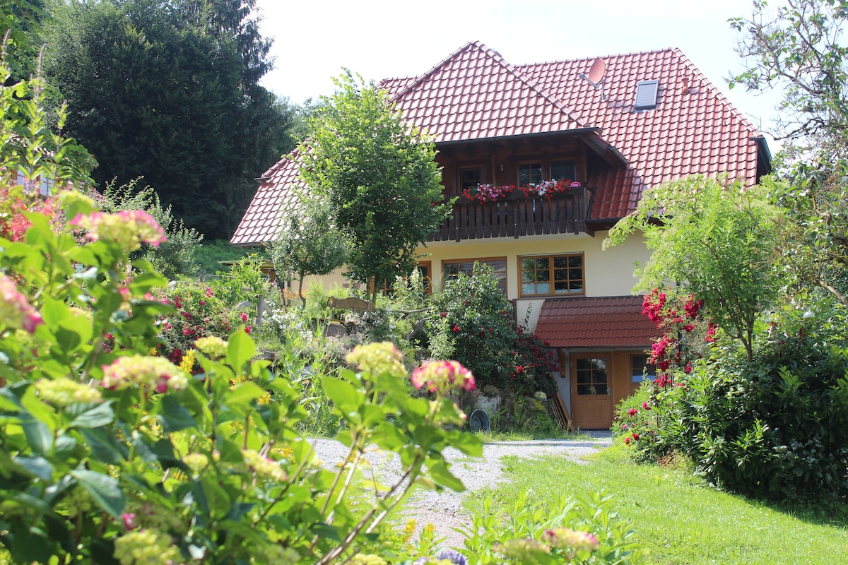 I lár na bhfíonghort, ar an bhfána theas, le radhairc iontacha den Kinigtal tosaigh, tá ár dteach in áit chúlráideach. Ar an gcéad urlár, ar an mbunurlár chuig an ngairdín, tá árasán atá feistithe go compordach, inar féidir leat a bheith compordach i ngach séasúr agus in aon aimsir. Tá seomra beo cistine, seomra leapa agus seomra folctha le chéile inrochtana ar thart ar 45 m2. Díreach taobh amuigh den doras tosaigh gheobhaidh tú cosáin fánaíochta gan deireadh tríd an bhForaois Dhubh.
