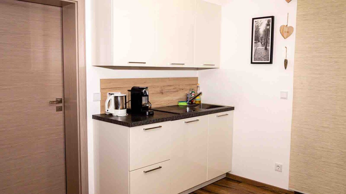 Fan san árasán stiúideo galánta ciúin i gcroílár Gersthofen. Tá suíomh tarraingteach ar fáil san árasán le rochtain éasca ar mhótarbhealach an A8 go München, Ulm agus Stuttgart. Tá áiseanna siopadóireachta faoi fhad siúil. Tá an linn eachtraíochta "Titania" lena limistéar mór sabhna nóiméad ar shiúl, mar atá lár Augsburg. Is féidir leat an Legoland a bhaint amach go héasca i gceann 25 nóiméad freisin.