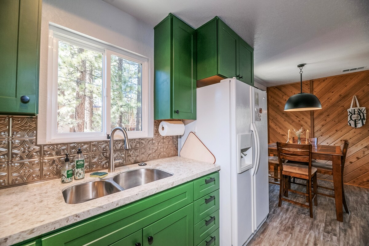 Welcome to Wildwood Haven. Stay with us, enjoy a mountain getaway tucked away in beautiful Moonridge in Big Bear. The cabin is centrally located to all the winter resorts, ski shuttle stop, the lake, shops & restaurants. The property sits on a large, serene lot surrounded by trees that offer privacy and a peaceful treehouse feel. The living room soaks in natural light through the large glass doors along the back wall that opens up to the wrap-around deck with outdoor dining set.