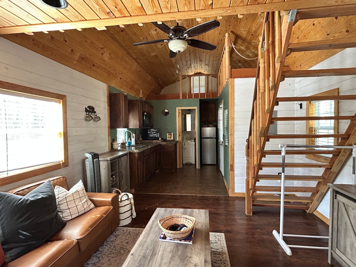 Tá an cábán seo níos fearr do lánúin nó do 2 dhuine fásta agus do 2 leanbh beag. Tá sé 375 troigh chearnach cábán. Taitneoidh m'áit go mór leat mar gheall ar an gcistin iomlán, an teolaíocht, agus na radhairc. Iontach d'eachtránaithe aonair, do thaistealaithe gnó, do theaghlaigh (le páistí), do ghrúpaí móra, agus do chairde clúmhacha (peataí). Ní ghlacaimid ach le madraí lánfhásta dea - iompartha. Áirítear leis sin gan cait. Is é dhá (2) uaslíon na madraí. Baineann táille le do mhadra a thabhairt leat. Léigh ár rialacha tí sula ndéanfaidh tú áirithint.
