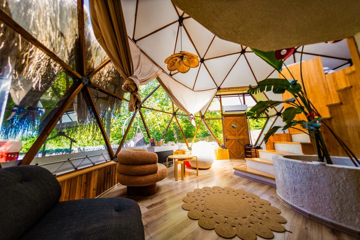 Heavenbird / Cennetkuşu Suit Dome, doğa ve göl manzarası eşliğinde max. 4 kişilik konforlu bir konaklama sunar. 250 m² bahçeli alanda size özel 3x5 m havuz, veranda üzerinde 2 kişilik dış mekan jakuzi ve barbekü alanı bulunur. Loft kat ana yatak, giriş kat oturma alanı ve ek yatak mevcuttur. Akıllı TV, internet, mutfak ekipmanları ve isteğe bağlı kahvaltı sunulur. Tesisimiz mahremiyet odaklıdır ve Sapanca merkeze 10 dk uzaklıktadır.