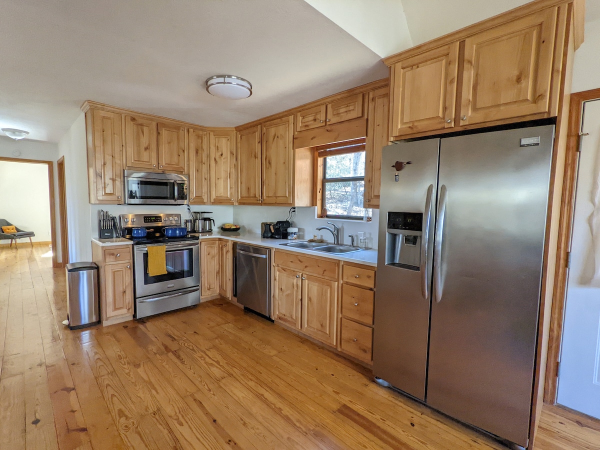Tá éalú chuig tearmann den scoth tuillte agat! Tá radhairc iontacha ar Killer View Cabin w/EV ó cheann ceann na bliana; tá sé gar don bhaile, do lochanna agus do nithe is díol spéise! Scaoil isteach an tobán te, bailigh le chéile timpeall an phoill dóiteáin lasmuigh, nó seinn an iliomad cluichí ardteicneolaíochta agus íseal a thairgtear. Bí ceangailte le hidirlíon ardluais agus spás oibre tiomnaithe. Cosúil le spóirt ?…tá cábla ann! Ag dul ann - déanann an bóthar atá beagnach go hiomlán pábháilte atá ar fáil, as a dtiocfaidh an pillín páirceála cothrom, teacht saor ó strus chuig ár gcábán gleoite.