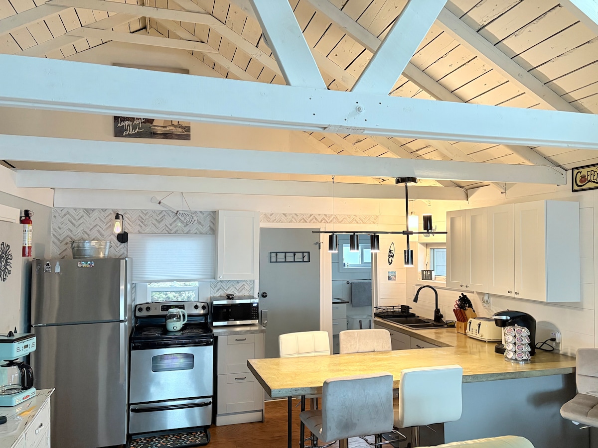 Tar ar bhaile álainn stairiúil Bayfield agus fan inár dteachín an - chic atá oiriúnach do theaghlaigh cois locha, ar a dtugtar an Sugar Shack go geanúil. Níl ach siúlóid aon nóiméad go dtí an trá agus siúlóid ghearr nó turas rothar go dtí cearnóg an tsráidbhaile inar féidir leat taitneamh a bhaint as siopaí agus bialanna áitiúla. Bí teolaí agus bain sult as am teaghlaigh le roinnt cluichí stua & vinil, beárbaiciú ar an bpaitió, lig do scíth sa phlocóid agus seinn tobán te, féach ar na páistí ag súgradh ar an seit súgartha nó las an tine champála agus bain sult as na hoícheanta réaltacha.