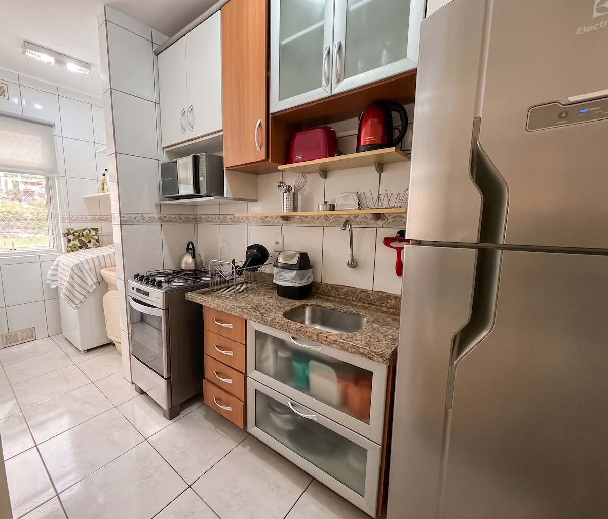 Árasán dea - shuite, gar do lár Blumenau agus gar do pháirc Vila Germânica (Oktoberfest, thart ar 4 km). Tá garáiste clúdaithe ann, balcóin le beárbaiciú, clós súgartha agus áit peataí. Tá cistin iomlán (cuisneoir, sorn, oigheann agus uirlisí) agus seomra leapa aerchóirithe san árasán. Tá tuáillí agus línéadach leapa againn.