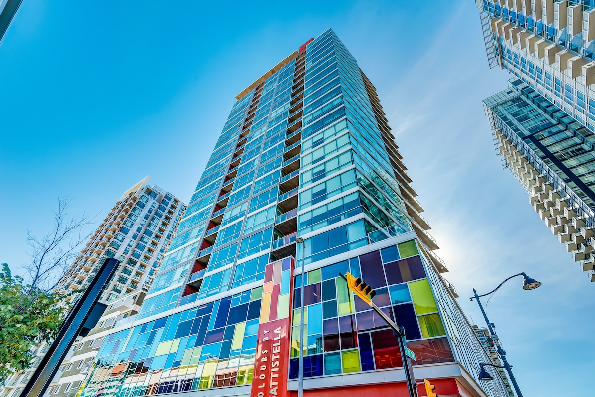Tá an t - árasán 1 leaba seo le radhairc iontacha suite i gcroílár na cathrach. Is féidir leat siúl chuig gach rud is mian leat laistigh de 15min nó fiú turas scútar cathrach níos giorra. Is siúlóid 5 nóiméad é an Ctrain freisin a osclaíonn suas an chuid eile de Mhórcheantar Calgary agus an bus 300 a théann díreach go dtí aerfort Calgary YYC agus uaidh. Achar siúil chuig bialanna, beáir, casinos, siopaí grósaera agus páirceanna. Tiomáint 2 uair an chloig go Loch Louise, 1.5 uair an chloig go Banff. Scannáin, seónna, agus os cionn 5000 Nintendo agus snes cluichí a choinneáil sásta tú.