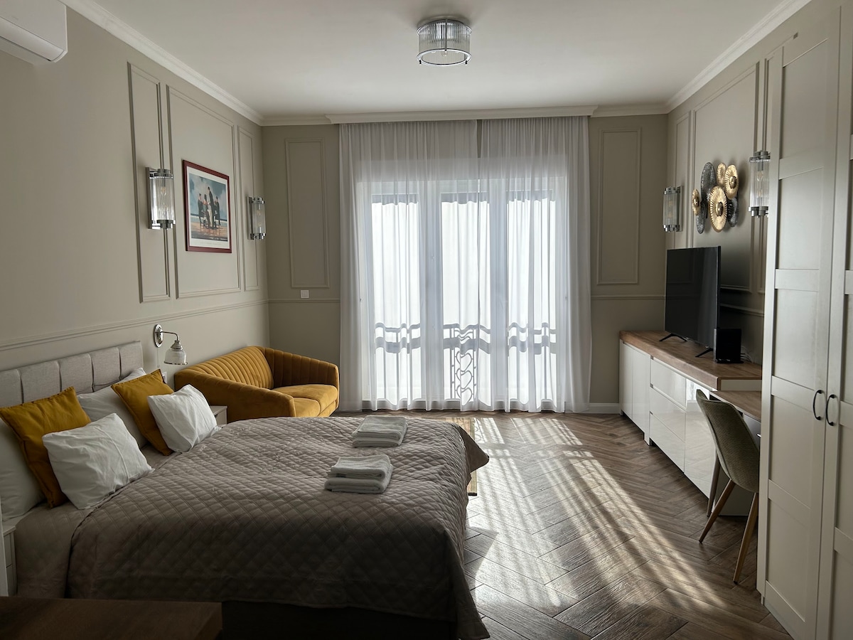 Árasán cathrach ard-stórach i seanfhoirgneamh stairiúil, faoi throscán galánta, le gach áis. Árasán i lár na cathrach le páirceáil phríobháideach, le nasc díreach leis an tsráid siúil, 100 m ón gcaisleán, 200 m ón trá, bialanna, clubanna oíche, caiféanna, beáir. Foirfe do theaghlaigh le páiste nó beirt pháistí, do lánúineacha. Níl an lóistín oiriúnach do 4 dhuine fásta, mar nach bhfuil ach tolg leathnaithe i gceann de na leapacha. Níl ach cistinéad sa teach, nach bhfuil oiriúnach don chócaireacht.