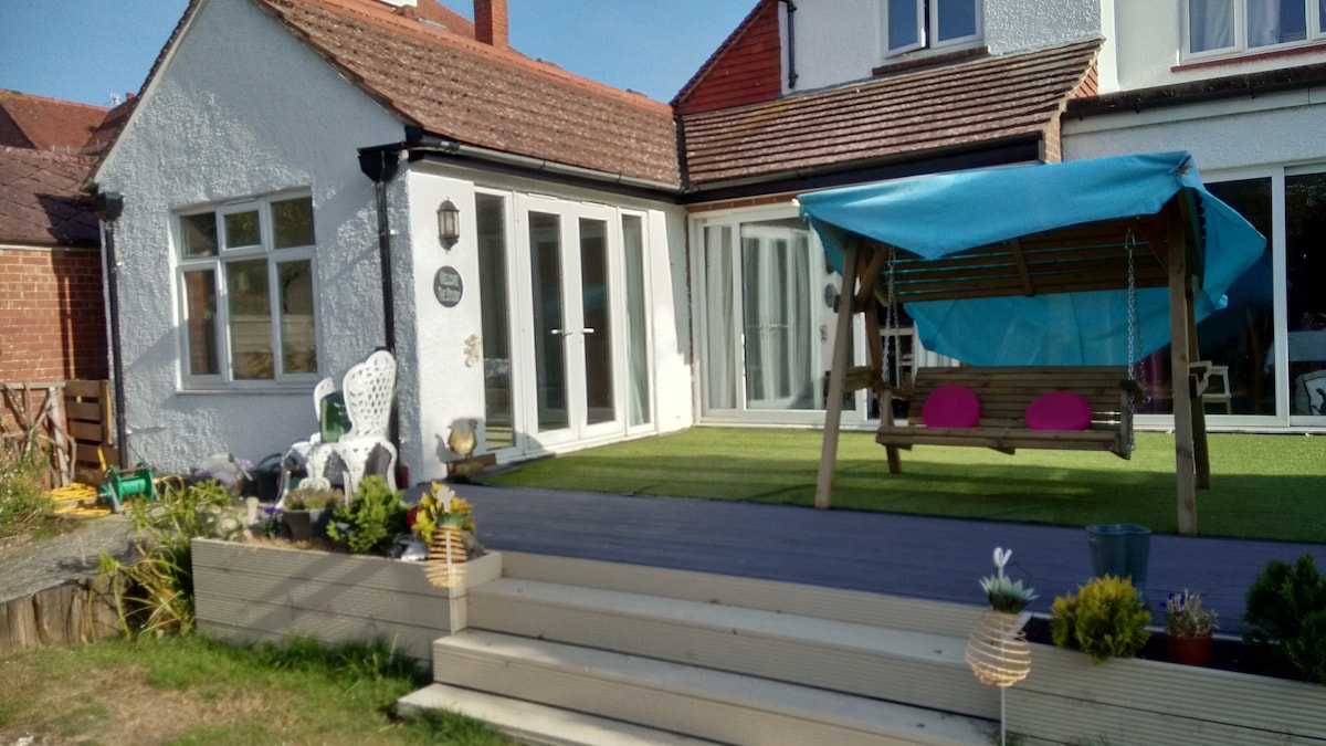 Suite i gceantar cónaithe maith ina bhfuil stáisiún Iarnróid Worthing, siopaí, bialanna, áiteanna beir leat agus tithe tábhairne laistigh de 5 -15 nóiméad siúil. Thart ar 13 mhíle ó Brighton agus Chichester agus 8 míle ó Arundel tuathúil. Tá leaba dhúbailte, leaba fhillte amach (táille bhreise *), tolg, cistinéad (cuisneoir, citeal, tóstaer & micreathonnán) agus gairdín ar mhéid maith ina bhfuil fáilte roimh aíonna a scíth a ligean. Tá áiseanna níocháin ar fáil ach socrú a dhéanamh roimh ré le Peter nó Lisa. * £ 15pn má tá 3 dhuine ag fanacht, £ 10 má tá 2 dhuine ann