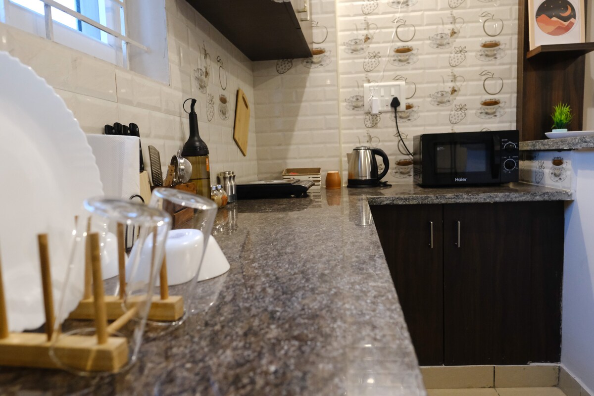 Braith go bhfuil tú tar éis éalú ón gcathair gan í a fhágáil. Tá an teach geal, fairsing seo atá dírithe soir agus atá clúdaithe i ndúil, suite sa chéad urlár i gceantar Electronic City i bpobal ciúin geataithe, 1 km ó Bhóthar Hosur (NH44). Tá sé foirfe do theaghlaigh, do ghairmithe, nó do thréimhsí fanachta níos faide, agus tá dhá sheomra leapa ann le folcadáin ceangailte chomh maith le háiteanna codlata príobháideacha agus cistin lánfheistithe. Tá teilifís chliste 55", Wi-Fi 200 Mbps, meaisín níocháin, cuisneoir mór, páirceáil agus slándáil 24/7 san áireamh. Glan, compordach, suaimhneach, teaghlaigh.
