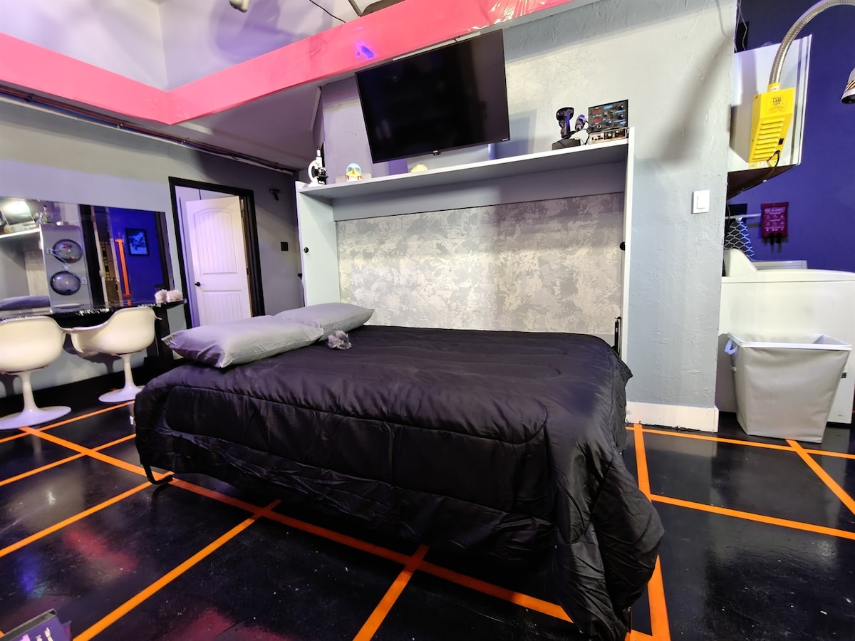 Blastoff to Starlab ‘86 - a retro sci - fi escape where the floor glows orange, the bed feel like a spaceship, and the shower looks out into the stars. Agus é spreagtha ag clasaicí sci - fi ‘80í, tá aclaí solais dhuibh, cuntair gléphláinéid, maos sa tobán te tar éis spásbhealach díreach mar a theastaíonn uait. Téigh ar foluain sa leaba ordaithe rímhéide nó fill an Murphy le haghaidh criú breise. Ní fanacht amháin atá i gceist - is radharc é ó théip VHS nach raibh sé i gceist agat riamh é a aimsiú.