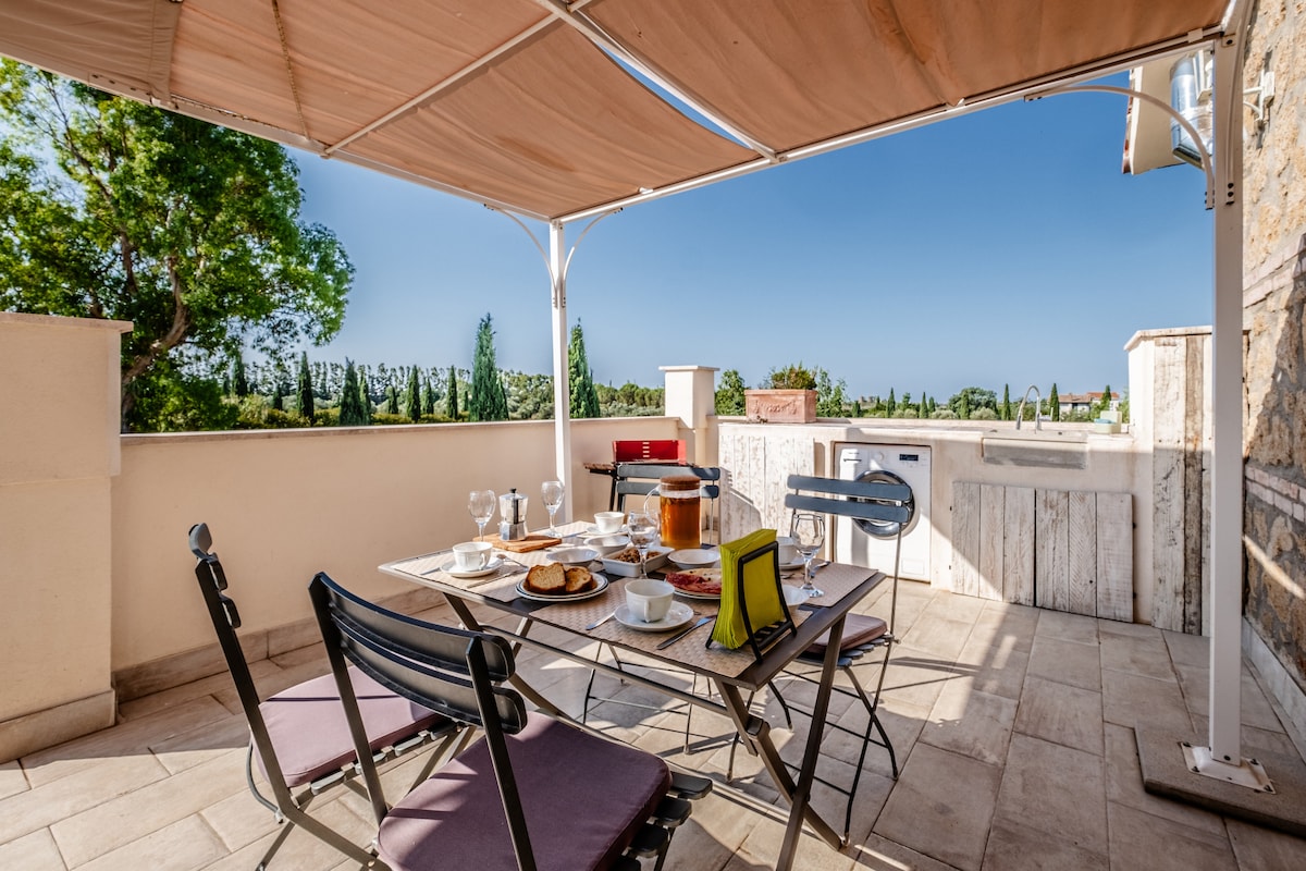 Tá compord nua - aimseartha agus áiseanna Spa nua - aimseartha sa teachín cloiche seo atá suite saor in aisce. Tá faichí móra na foraoise agus an mhóinéir ann agus tugann siad radhairc lánléargais ar an ngleann i dtreo Val d'Orcia ó thuaidh, an Maremema fairsing ó dheas, agus bolcán ársa Amiata ar an taobh thiar. Is é seo an tsaoire fhoirfe dóibh siúd ar mian leo tearmann príobháideach a fháil uathu chun iniúchadh a dhéanamh ar fhíon saibhir, bia, cultúr, stair agus tírdhreach dheisceart na Tuscáine.