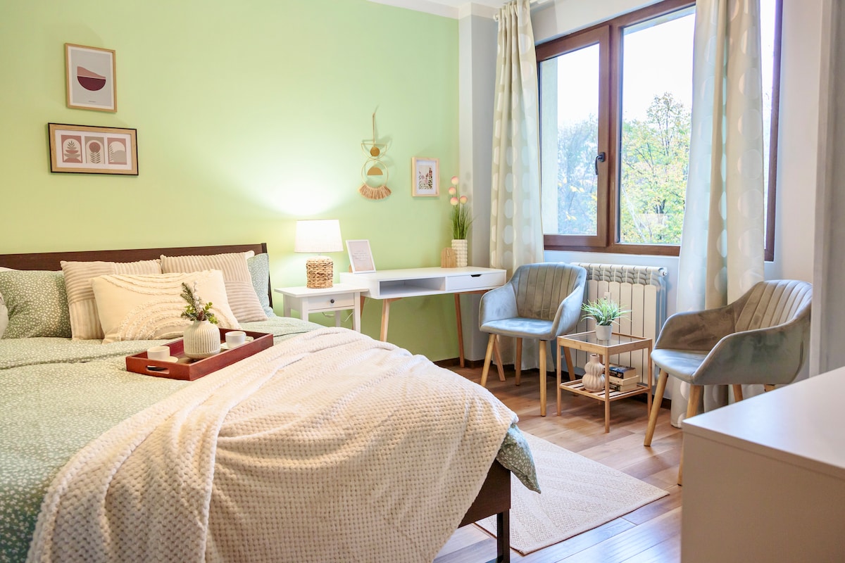 Faigh blaiseadh de chompord nua - aimseartha sa lochta geal 51 méadar cearnach seo in aice le "Borisova gradina" Park agus Eagle's Bridge. Bain sult as maisiúchán bríomhar, aclaí adhmaid, agus dhá leaba ildánacha (90x200cm). Agus tú suite go foirfe, is céimeanna thú ó na príomhrudaí is díol spéise i Sóifia, le rochtain éasca ar iompar poiblí. - Teilifís Android a rothlú le Netflix - Íontóir aeir le scagaire HEPA - Cistin lánfheistithe - Wi - Fi ardluais (91 Mbps) - Foirgneamh nua a bhfuil dea - bhail air Déan áirithint anois chun an chuid is fearr de Shóifia a bhlaiseadh!