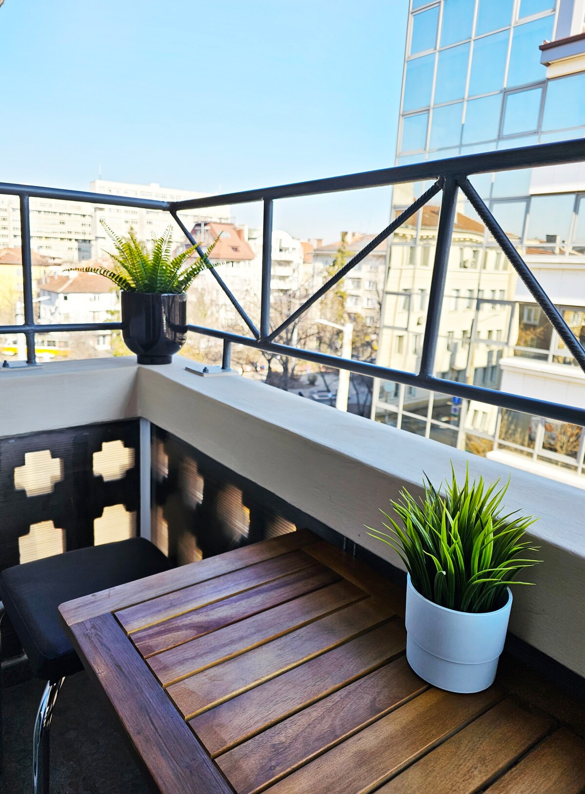 Stiúideo grianmhar agus cluthar (45 sq.m.)atá suite i bhfoirgneamh úrnua i gcroílár Shóifia. Soláthraíonn an t - ardán ollmhór radharc uathúil agus an - neamhchoitianta ar an suíomh lárnach seo. Ahh, an radharc, tá an radharc ar cheann de chineál <3 Tá an t - árasán suite i lárcheantar Reduta gar do Mall Serdika. Tá an t - ionad stairiúil 15 nóiméad siúil, tá sliabh Vitosha 10 nóiméad ag tiomáint i gcarr/i dtacsaí agus tá an tAerfort 6km nó 10 nóiméad ag tiomáint sa charr/i dtacsaí.
