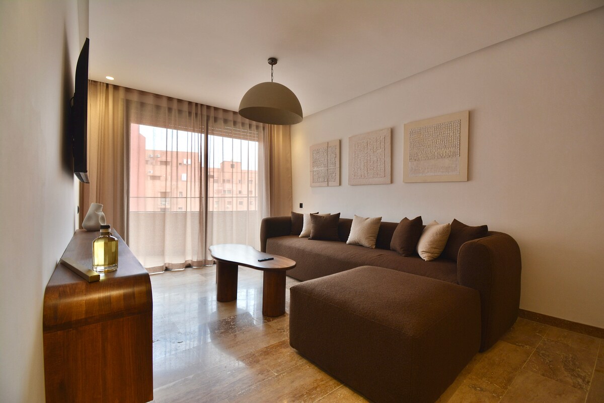 Árasán galánta nua atá suite i gceann de na comharsanachtaí is sláine gar do gach saoráid (búistéir, siopa grósaera, sneaiceanna agus bialanna), 2 nóiméad ó Dhámh an Leighis, agus caith cloch ó Guéliz (5 nóiméad) * Le seomra suí sómasach nua - aimseartha. * A 50 teilifíse le cainéil satailíte, Netflix, Youtube... * SNÁTHOPTAICE ag 100mbps. * Cistin lánfheistithe * Seomra fairsing le hardán. * Aerchóiriú láraithe. * Foirgneamh an - ghlan le páirceáil phríobháideach faoi thalamh.