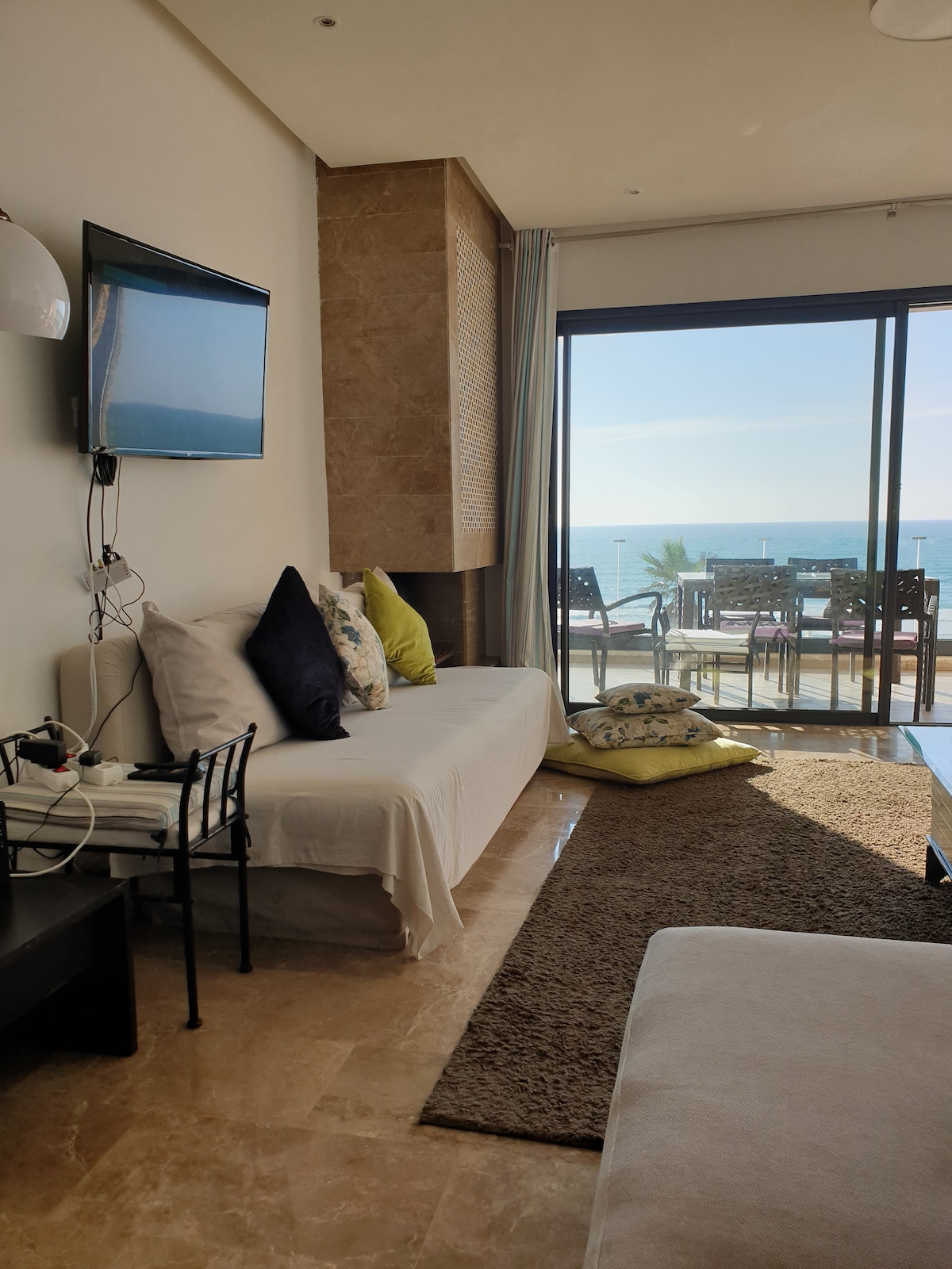 Árasán álainn cois trá in áit chónaithe shlán le linn snámha atá suite in Prestigia - Plage des Nations díreach 20 nóiméad ó Rabat. Suite ar an gcéad urlár den fhoirgneamh (le hardaitheoir) bearta an árasáin thart ar 105 m2 agus tá sé comhdhéanta mar seo a leanas: bealach isteach ar sheomra suí / bia ina bhfuil teallach agus ardán, dhá sheomra leapa (máistirsheomra leapa le seomra folctha príobháideach, balcóin agus radharc farraige, cúpla seomra leapa), seomra folctha eile, cistin feistithe. Radharc ar spéirlíne an aigéin